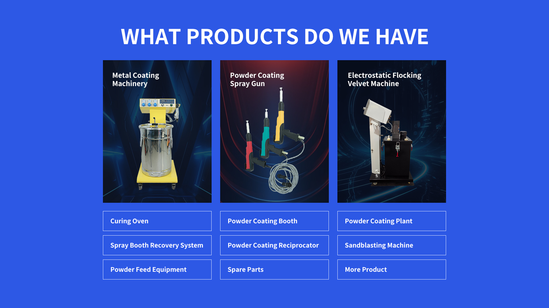 A Manual Powder Coating Machine is a user-operated system for applying dry powder coatings to metal surfaces. Key components include a powder spray gun, electrostatic generator, compressed air supply, powder hopper, and a curing oven (optional).